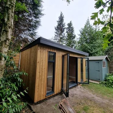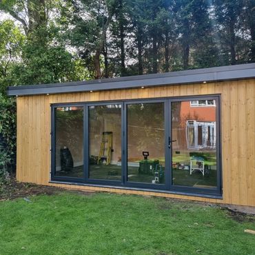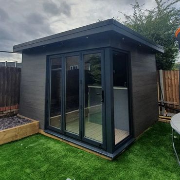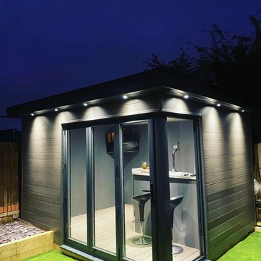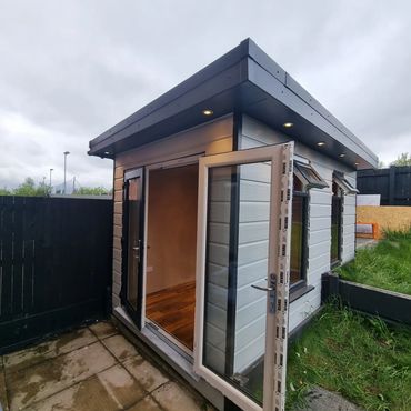 Cladded in anthracite grey EPDM rubber roof with 20 year guarantee , Double Glazed upvc doors and windows , full electrics , sockets , heater and downlights,